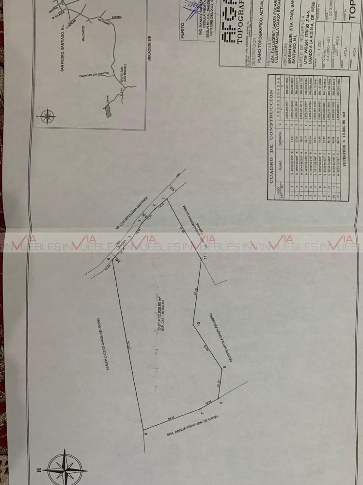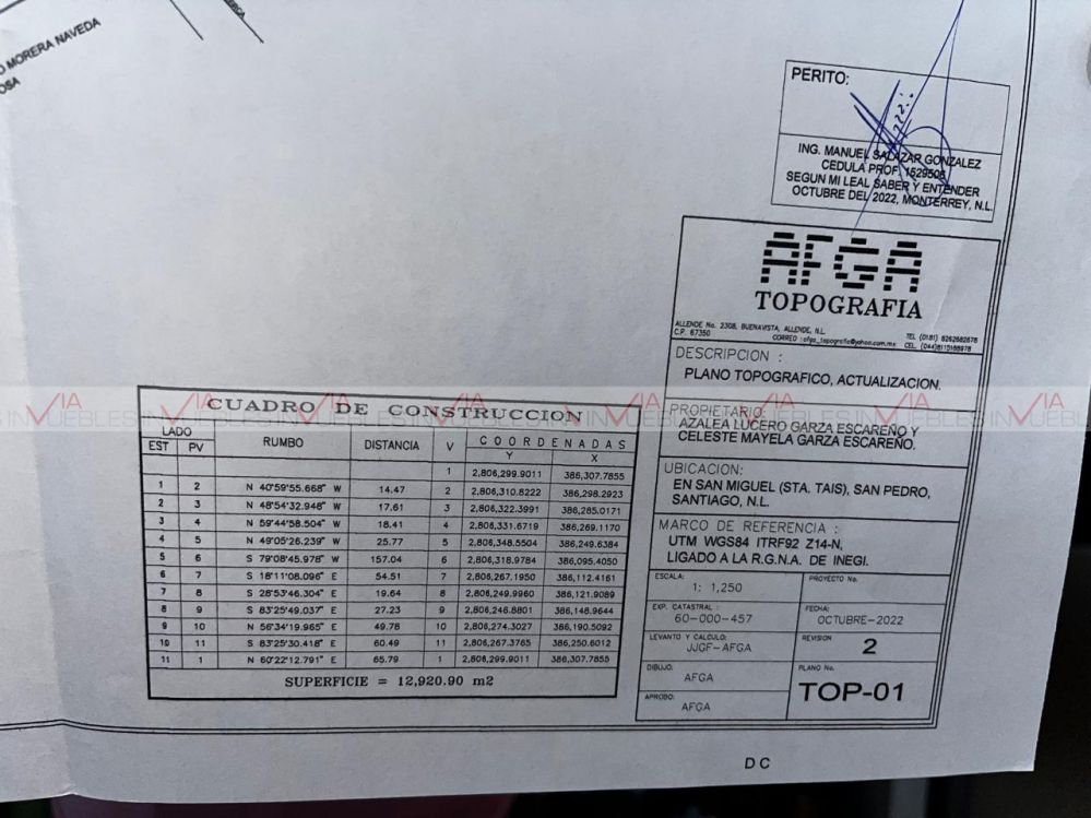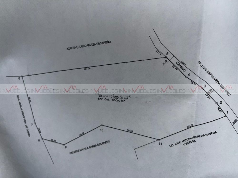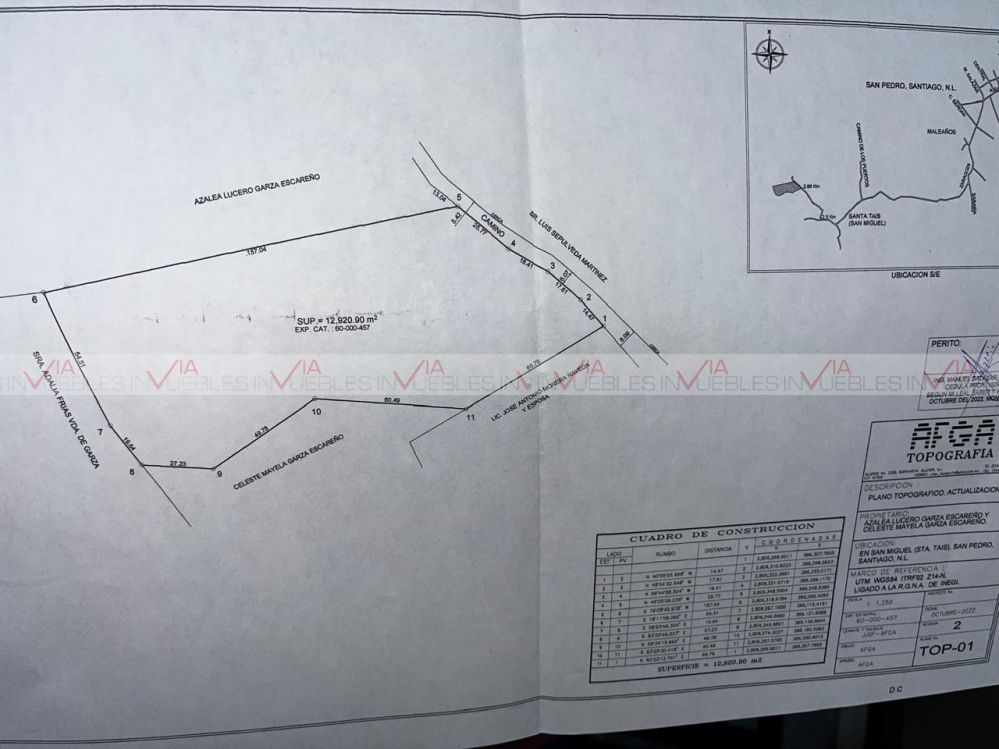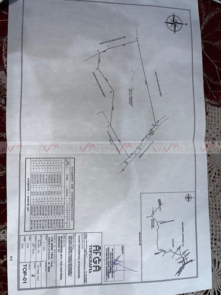 Terreno campestre, no urbanizado, ideal para cabañas o casa de descanso. Ubicado en San Pedro, Santiago N.L. Rodeado de árboles y naturaleza. El total del terreno es de 12,920 mts2 con superficies ascendentes y descendentes. Predial al corriente, libre de gravamen, papelería en regla, listo para escriturar.