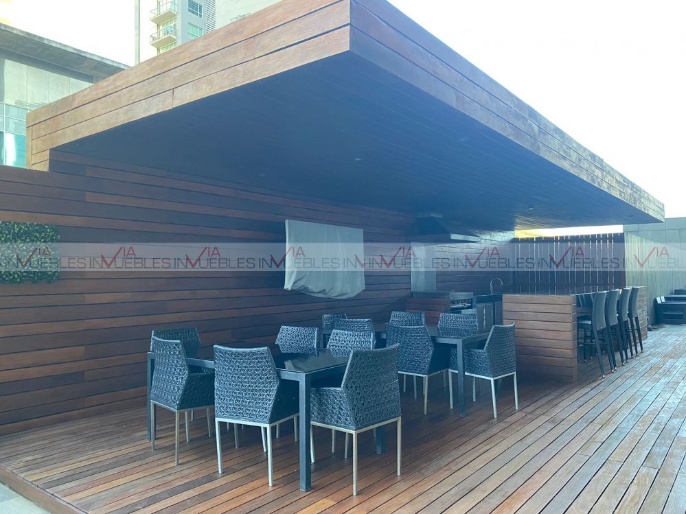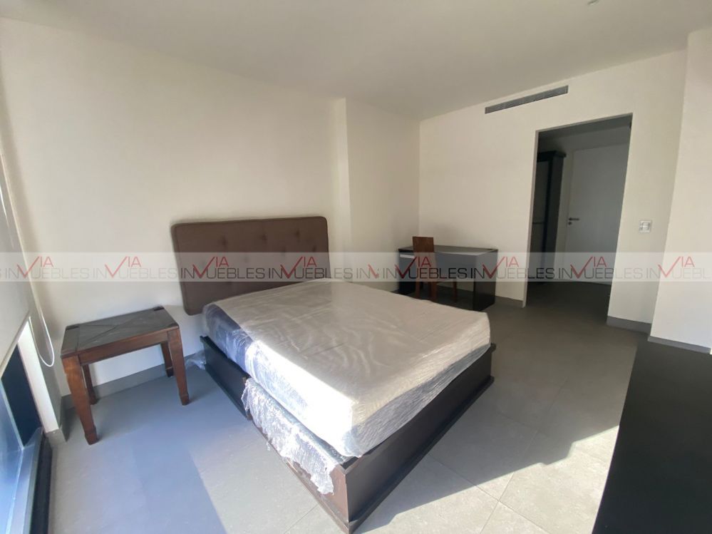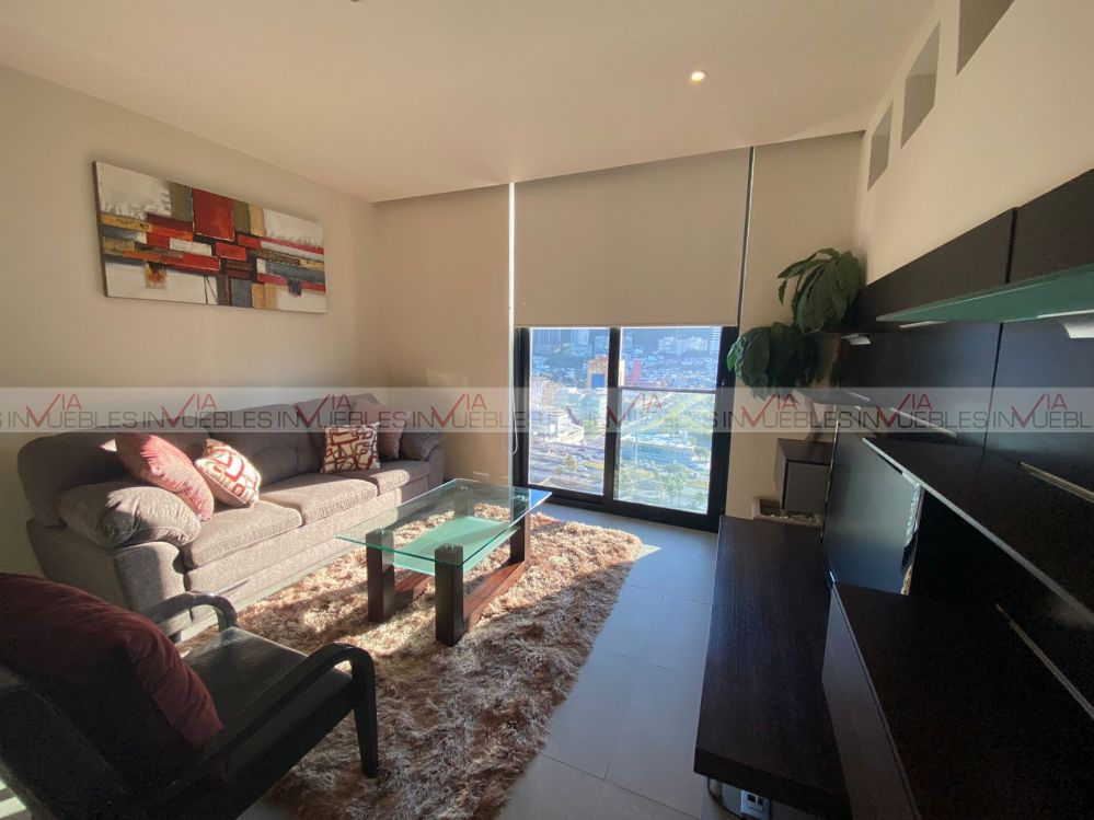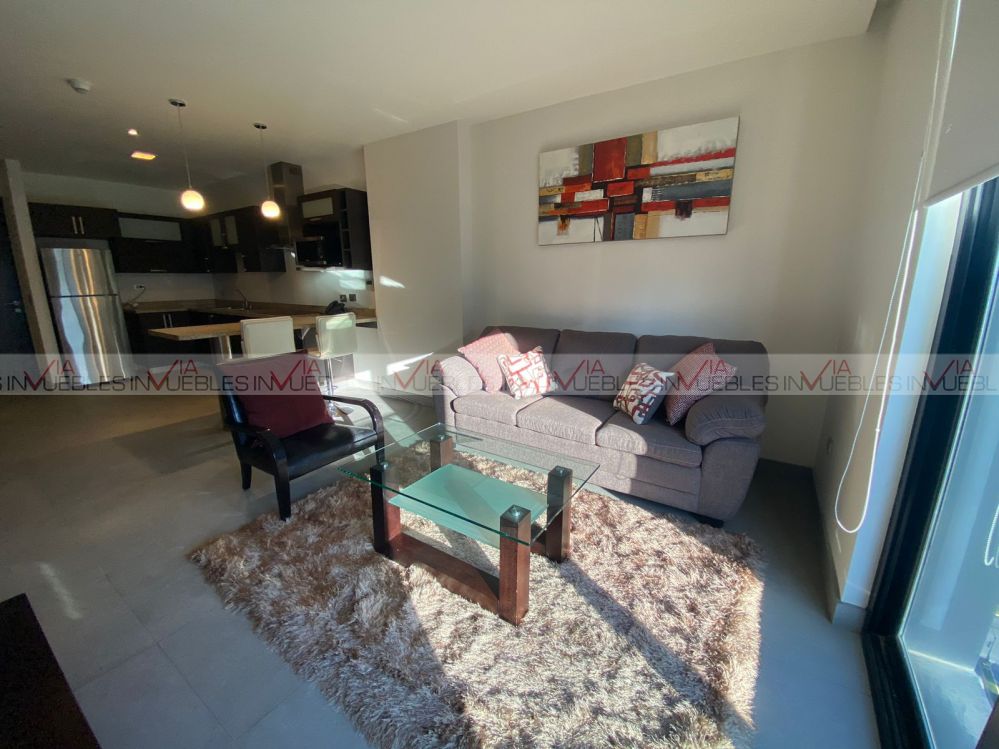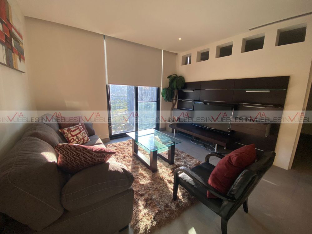Departamento amueblado en torre Magma Towers, con ubicación privilegiada en Valle Oriente. Cuenta con 1 recámara con escritorio, walk-in closet con baño completo. Sala, comedor con mueble de Televisión, ventanal deslizable con vista hacia la Sierra Madre. Cocina integral con refrigerador, parrilla con campana, micoondas, barra desayunadora con 2 sillas. Equipado con clima central, lavasecadora, boiler, sink. Le corresponde 1 cajón de estacionamiento, seguridad 24/7.