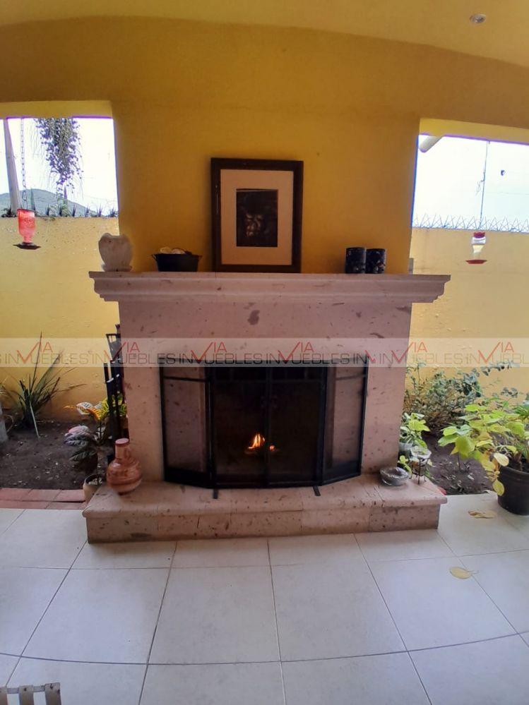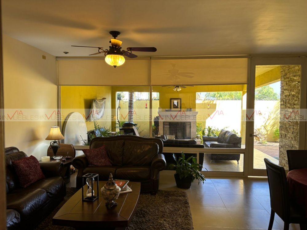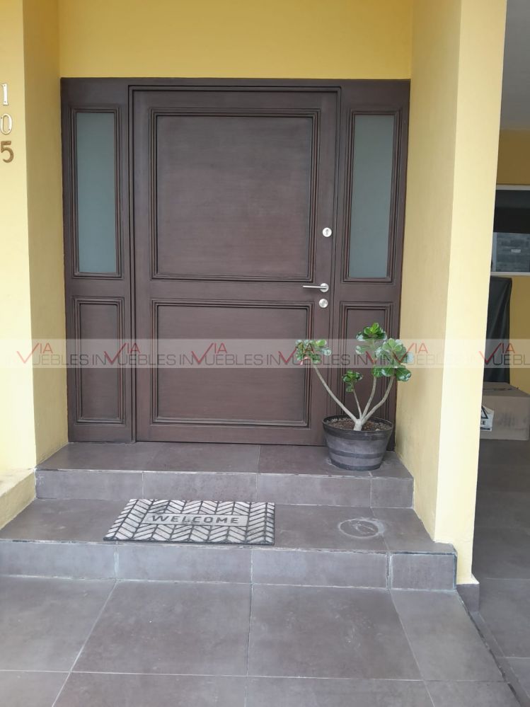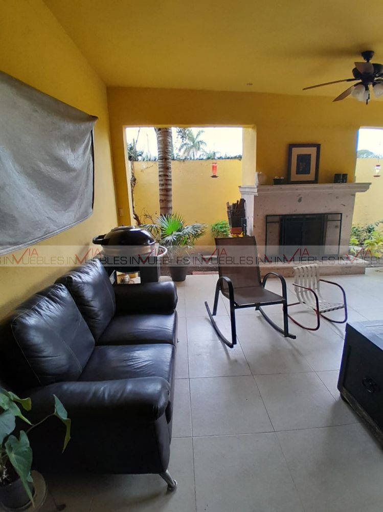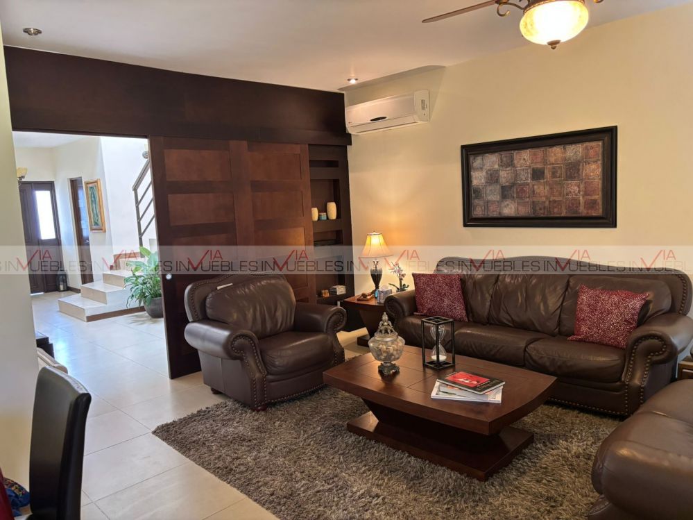 Hermosa residencia en venta dentro de un fraccionamiento privado con caseta de seguridad en carretera nacional cerca de escuelas, hospitales y centros comerciales, con un frente de 12 metros, el garaje ofrece 3 lugares de estacionamiento, amplia estancia de sala y comedor con puertas corredizas de madera para dar mayor privacidad en las áreas.