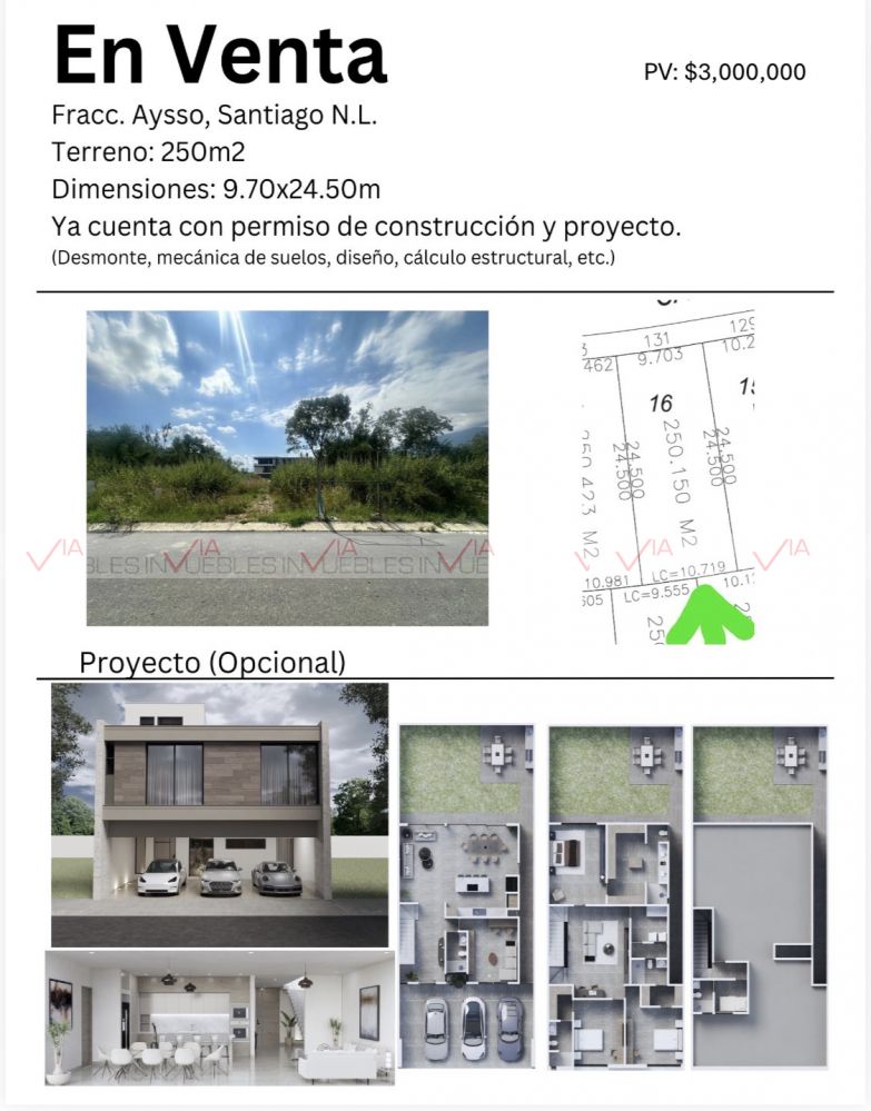 AYSSO es un terreno residencial de 250m2 con 24.5 metros de frente y 9.7 metros de fondo, ideal para construir la casa que siempre has deseado. Ubicado en una zona en crecimiento y con todos los servicios disponibles, este terreno te brinda la oportunidad de vivir en un entorno tranquilo y seguro, pero con fácil acceso a todo lo que necesitas. No pierdas la oportunidad de adquirir este terreno y hacer realidad tus sueños de tener tu propio hogar. proyecto de construcción disponible con costo aparte, incluye desmonte, mecánica de suelos, diseño, calculo estructural .