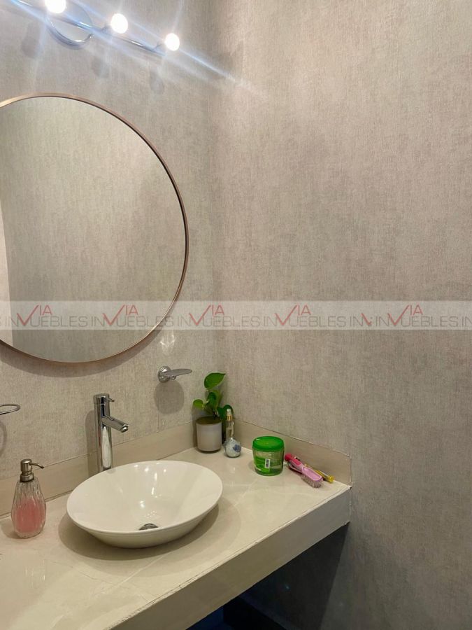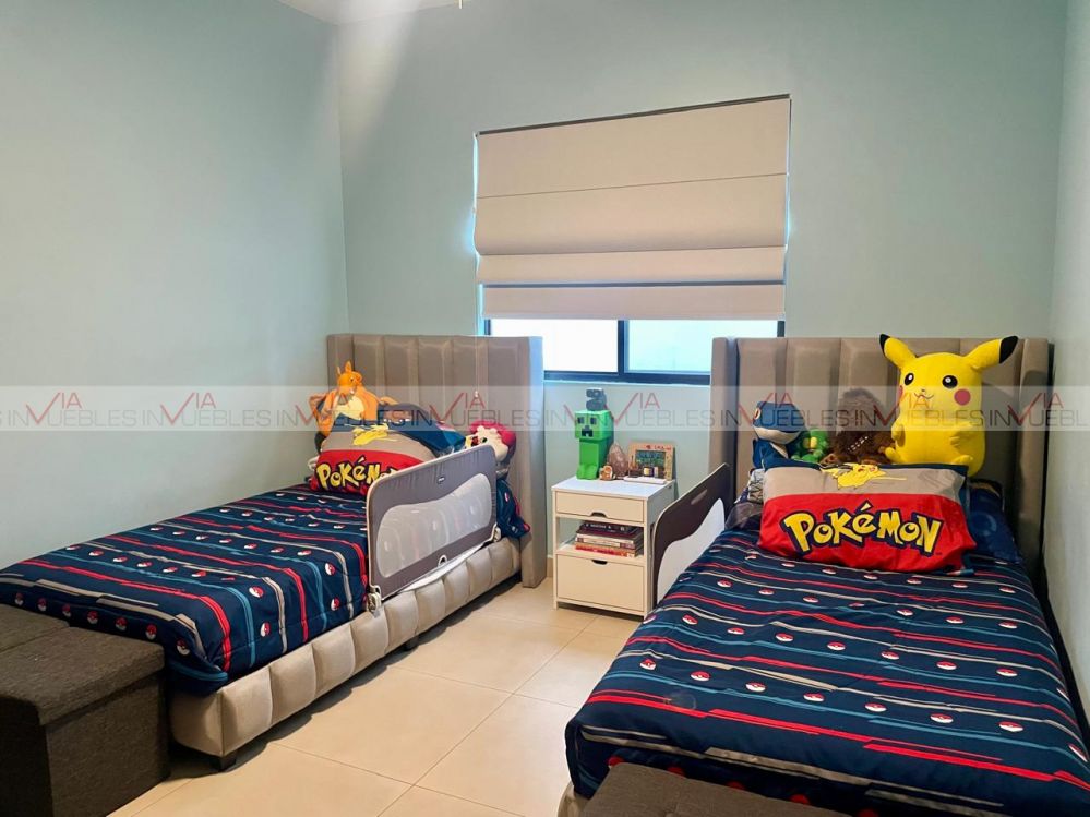 Planta alta: recámara principal con vestidor y baño, estancia de televisión, sink, 2 recámaras secundarias con closet que comparten baño completo.