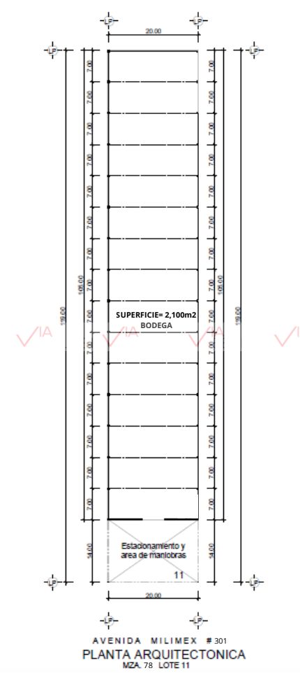 Con 20 metros de ancho y 105 de fondo, piso de concreto 250, armado con malla electrosoldada 6-6-10-10, 15 cm de espesor, altura 11.50 al centro y 8 a los lados, techo de lámina y lámina traslucida.