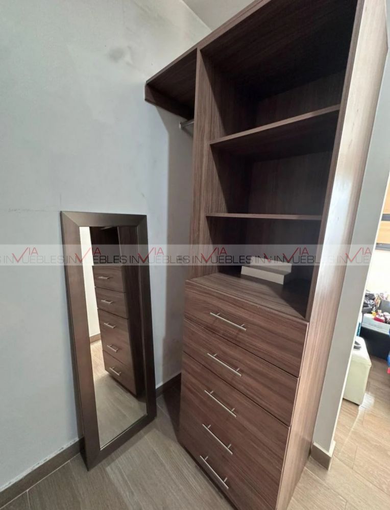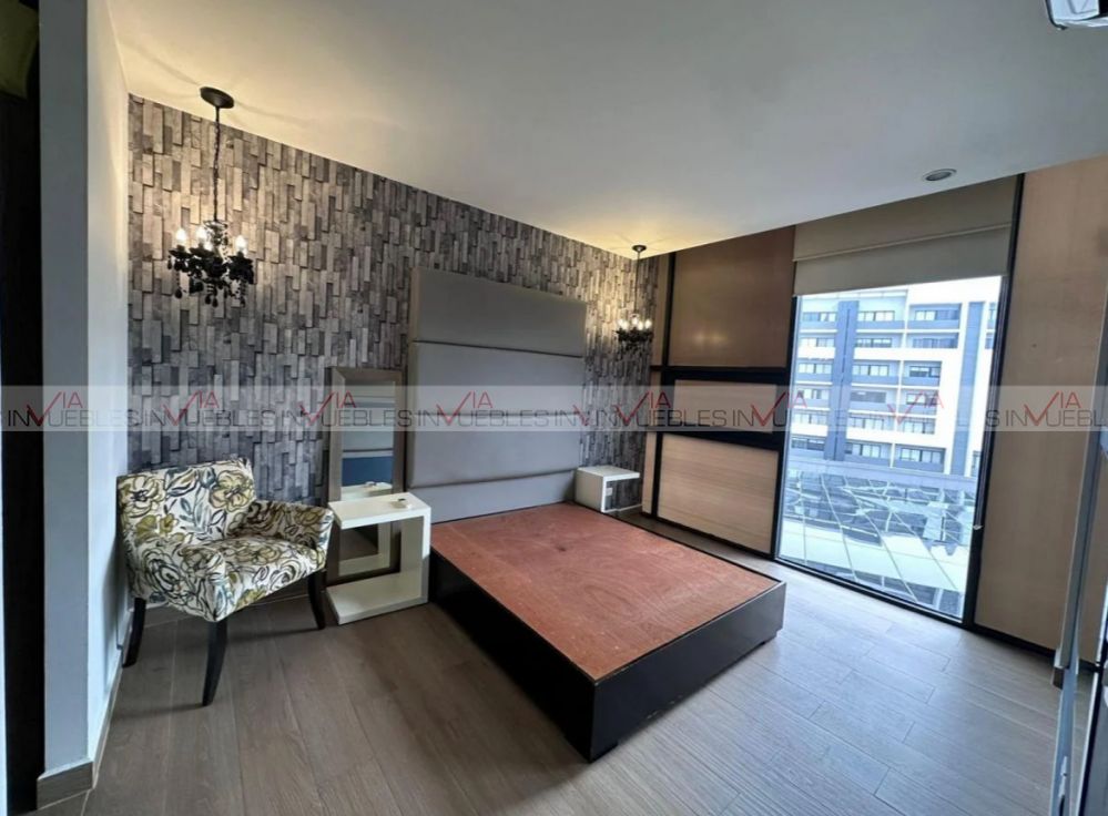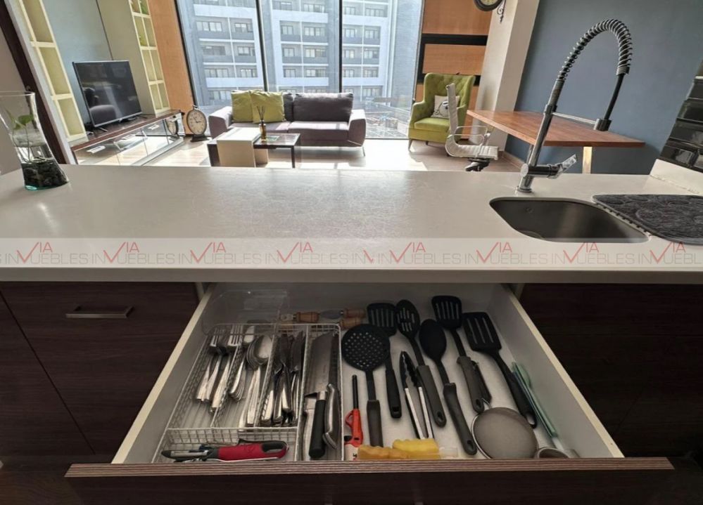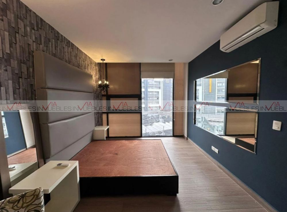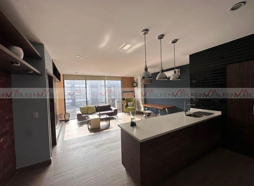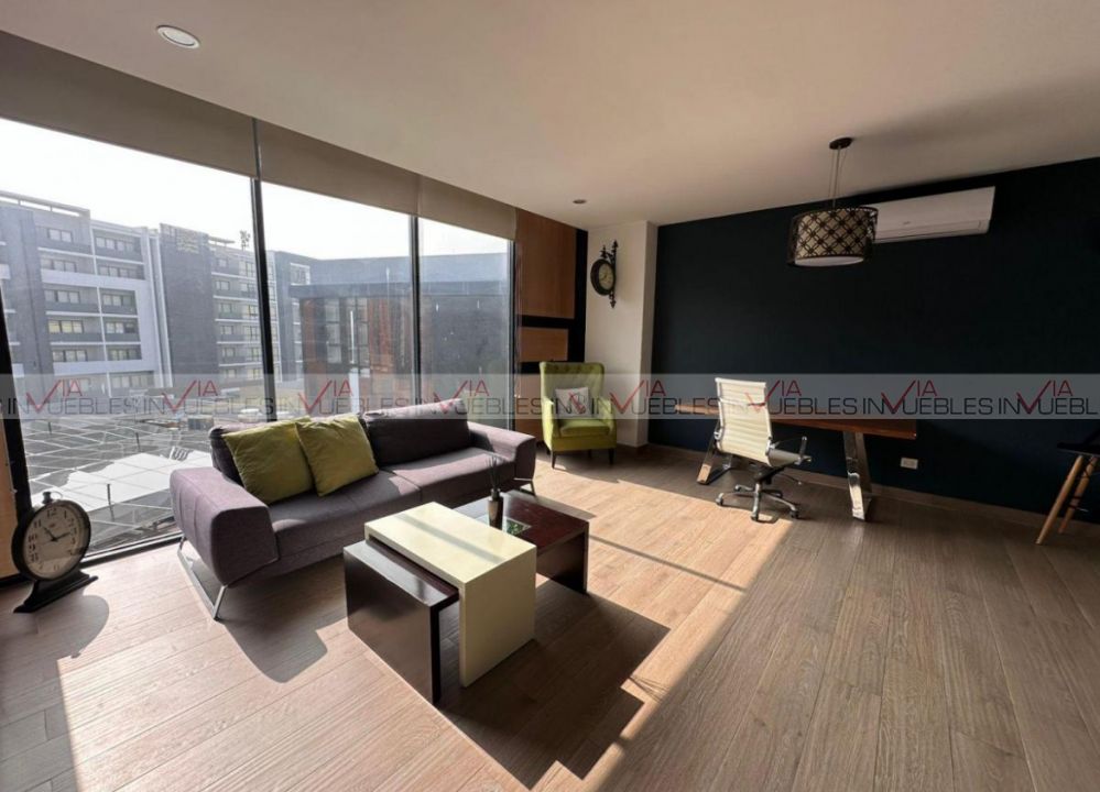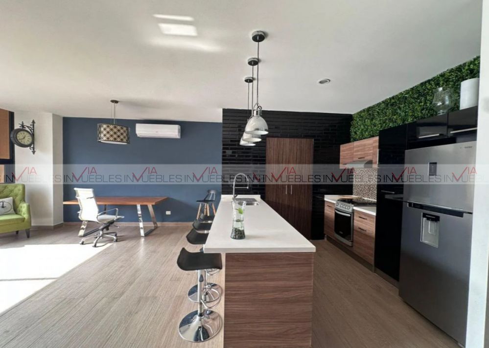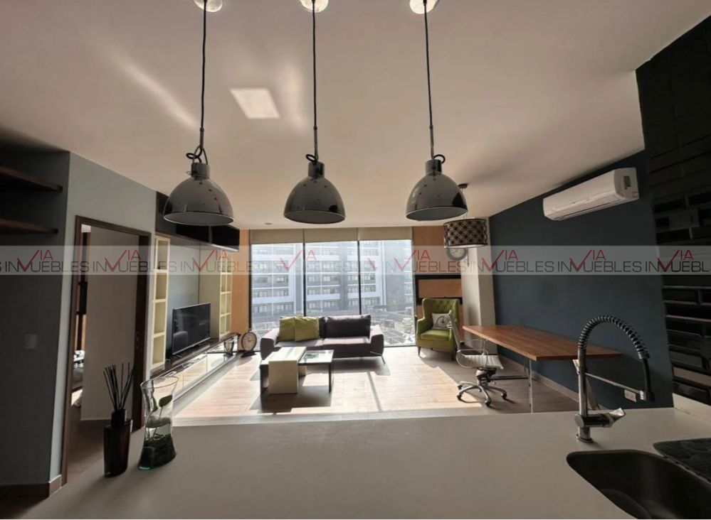 Departamento amueblado de73 mts. En Torre exclusiva con acceso desde la calle principal de la Plaza de Nuevo Sue con vista al cerro de la Silla. Consta de 1 recámara, 1 baño completo, 1 cajón de estacionamiento, cocina con barra de Corian, estufa, refrigerador, centro de lavado, minisplit, clóset, base de cama, librero, sala y mesa de comedor