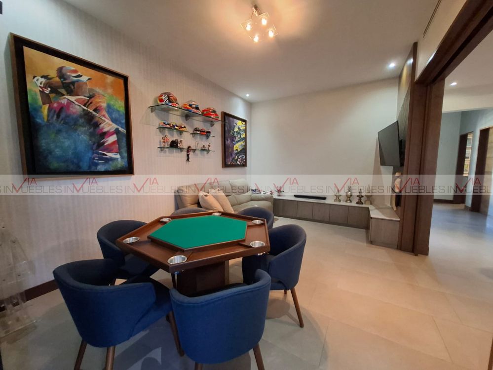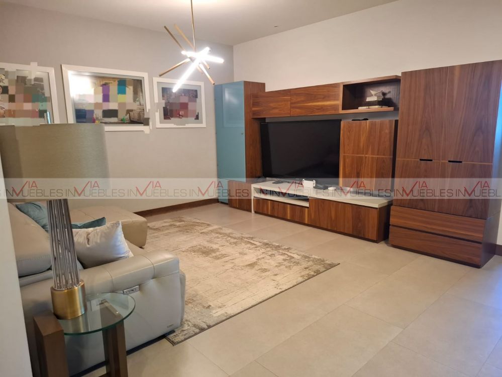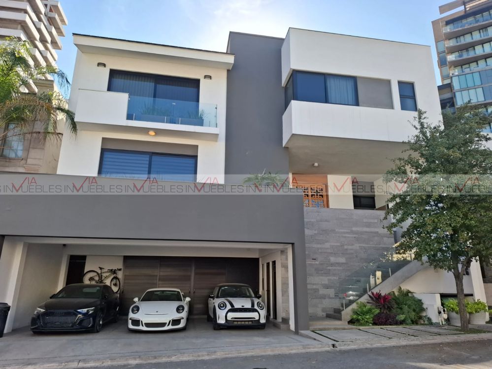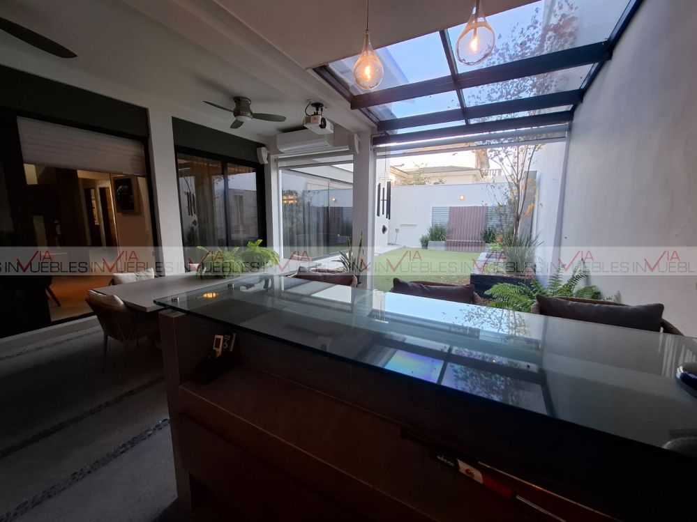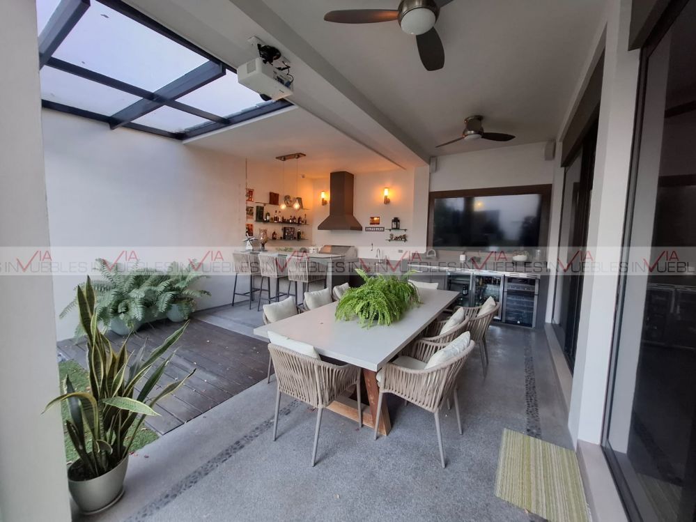 Hermosa casa amueblada en exclusiva zona de Valle Oriente, Privanzas. 3 plantas, 4 habitaciones, 6 baños, 1 medio baño. Amplia estancia, cuarto de juegos, terraza, lavandería, patio con área social y proyector, 3 estacionamientos. Cuarto de servicio independiente, bodega, amueblada, amplia sala-comedor, cocina integral, paneles solares. Parque muy cerca. Ideal para ejecutivo con familia. No mascotas.