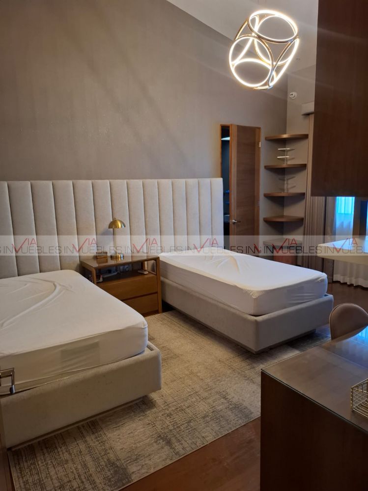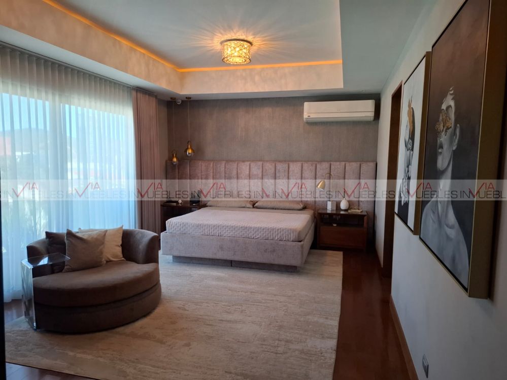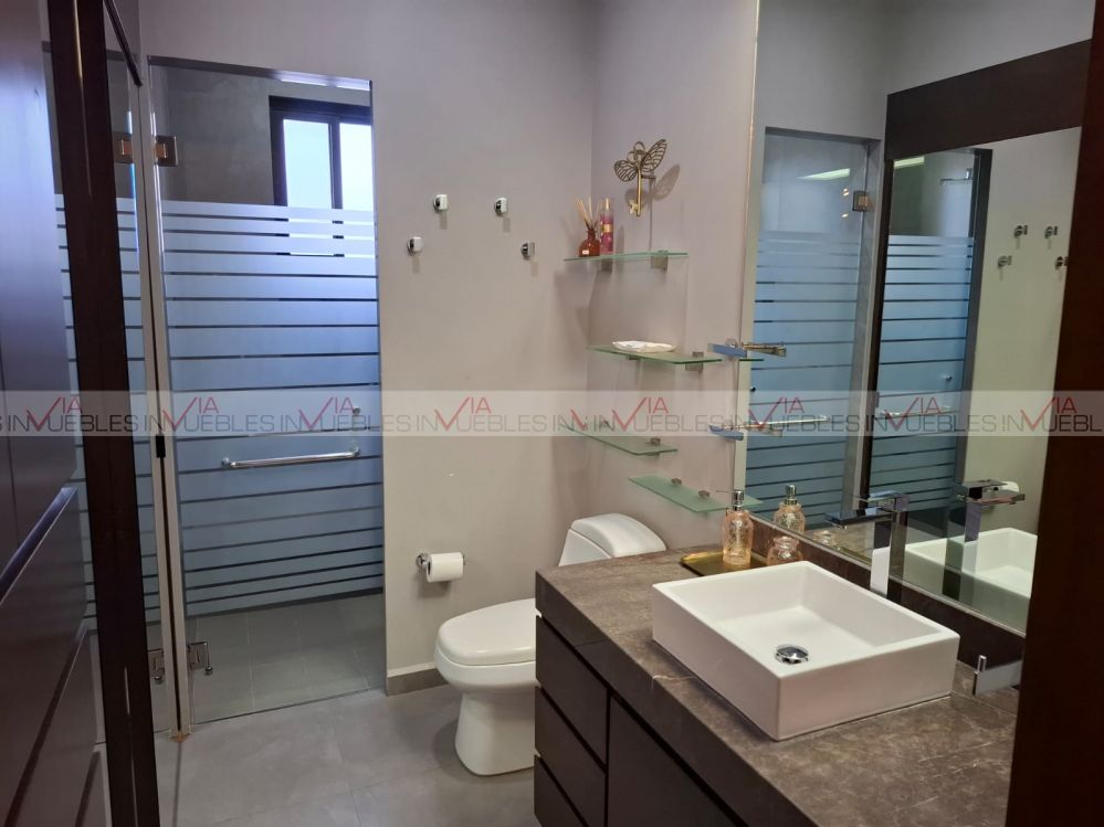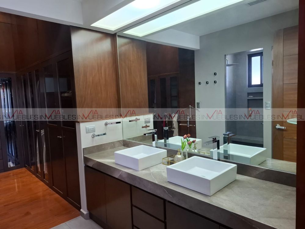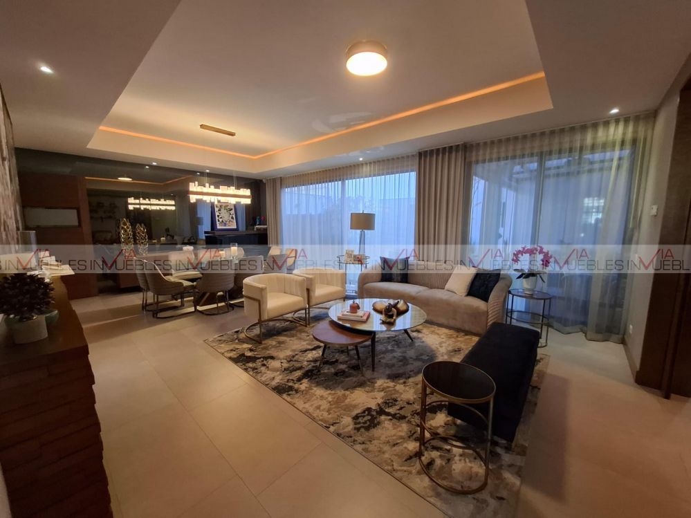 Hermosa casa amueblada en exclusiva zona de Valle Oriente, Privanzas. 3 plantas, 4 habitaciones, 6 baños, 1 medio baño. Amplia estancia, cuarto de juegos, terraza, lavandería, patio con área social y proyector, 3 estacionamientos. Cuarto de servicio independiente, bodega, amueblada, amplia sala-comedor, cocina integral, paneles solares. Parque muy cerca. Ideal para ejecutivo con familia. No mascotas.