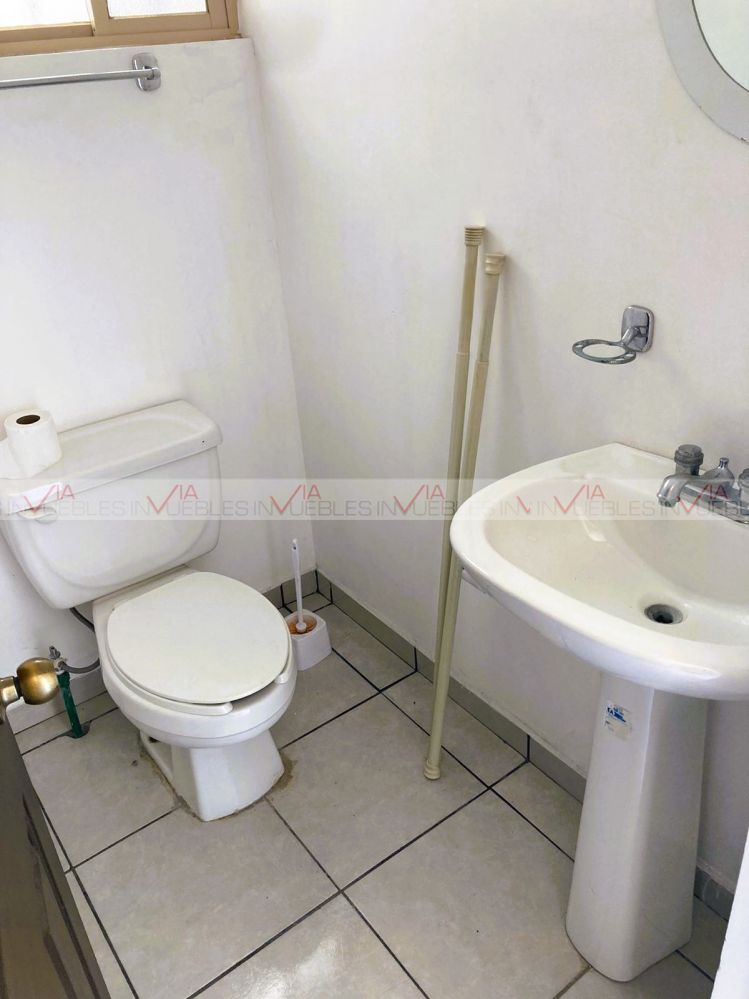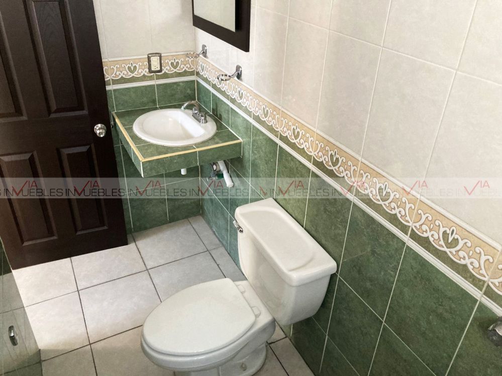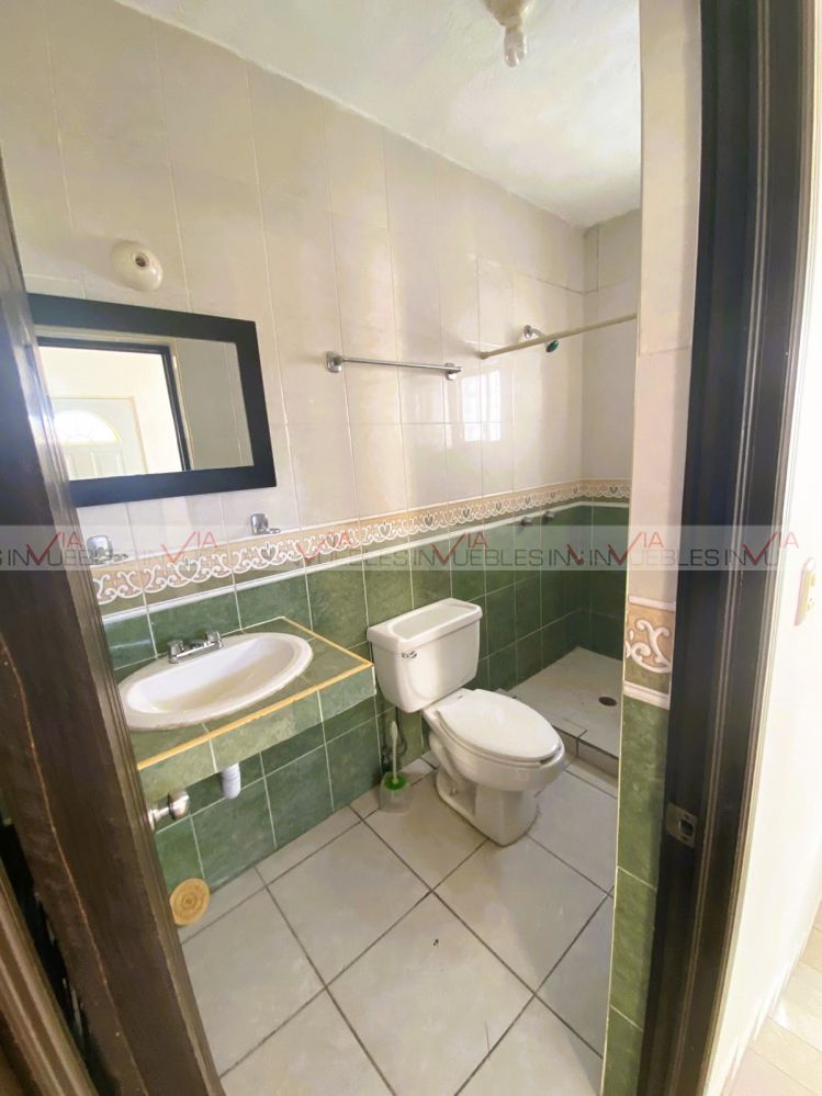 Planta baja: sala-comedor de concepto abierto, medio baño, cocina integral con estufa. En exteriores, amplio patio trasero con pasillo que conecta con el frente, estacionamiento para 2 autos y jardín.