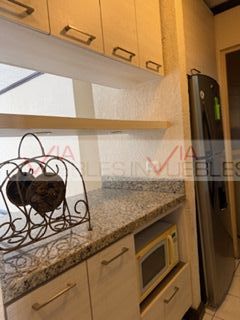 Cómodo y bien ubicado departamento en el primer nivel de la Torre Galerías, cuenta con 2 recámaras, 2 baños completos, equipado con una moderna cocina integral con cubierta de granito, barra desayunadora con luz, área de lavandería con lavadora, secadora, tallador y boiler, micro, minisplit y abanicos de techo en todas las áreas, balcón.