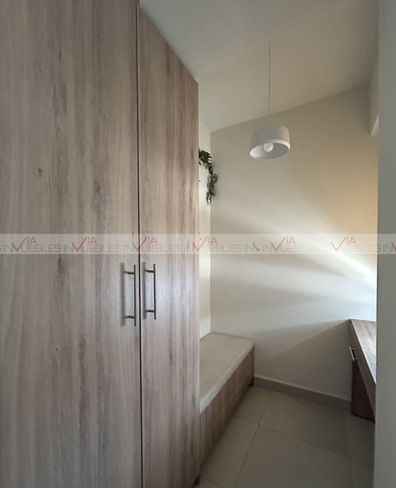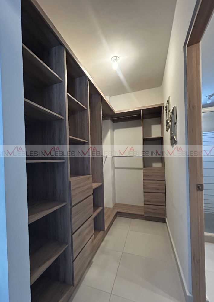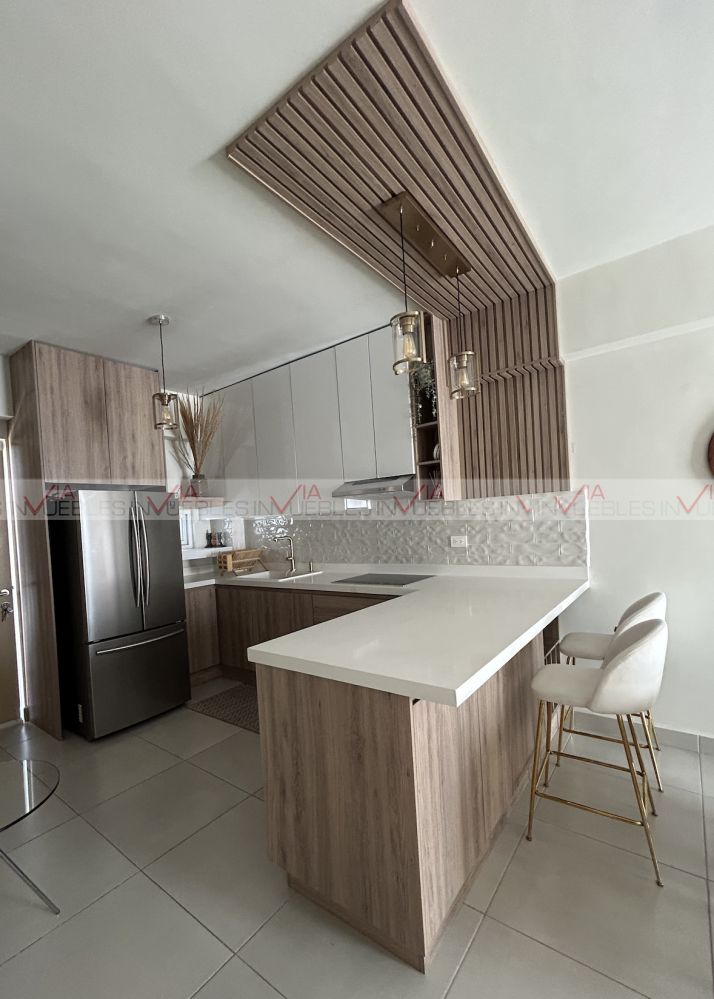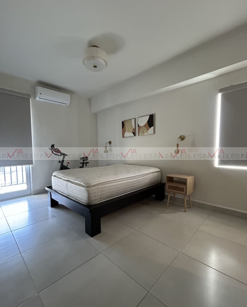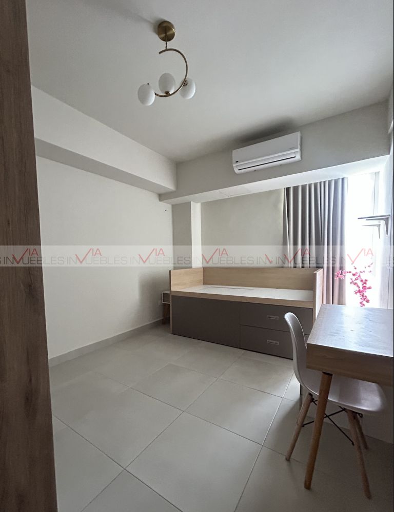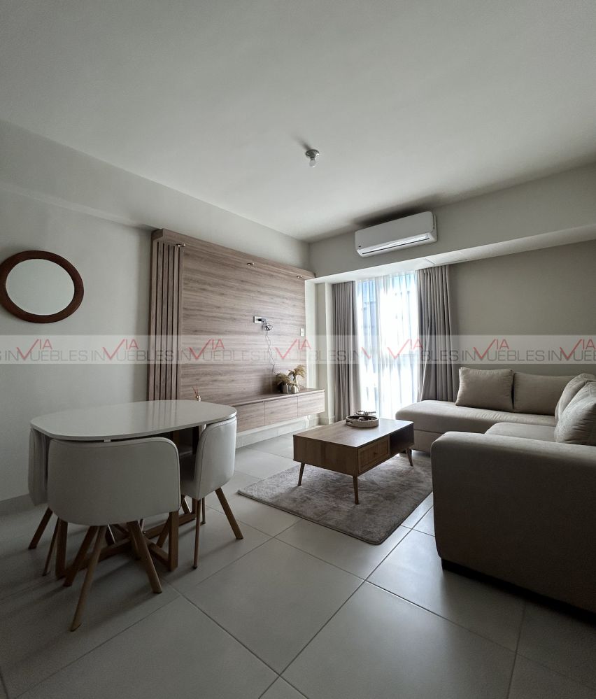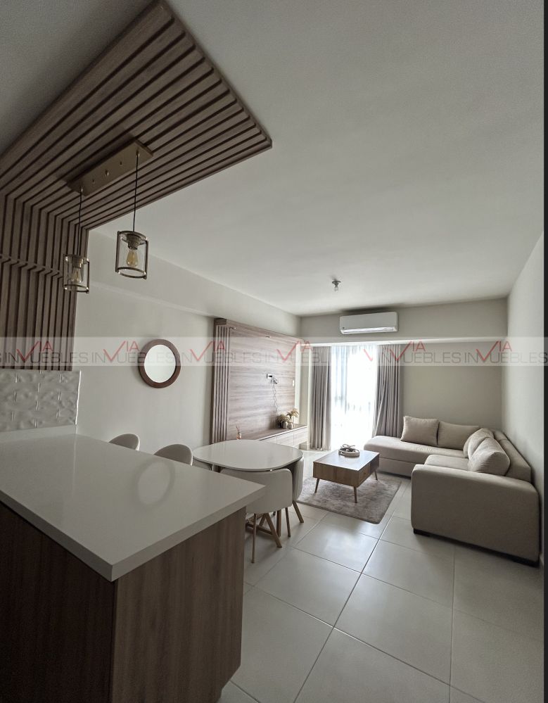 Hermoso Departamento Amueblado en un conjunto residencial. Cuenta con dos recámaras: la recámara principal con baño completo, walking closet, pequeño balcón, minisplit y cortinas black out, la recámara secundaria cuenta con closet, minisplit y cortinas black out, baño completo para visitas, una amplia sala y comedor con minisplit, mueble de TV moderno y de gran calidad con cortinas black out. Hermosa cocina integral equipada con campana, estufa eléctrica y tarja de cerámica blanca.