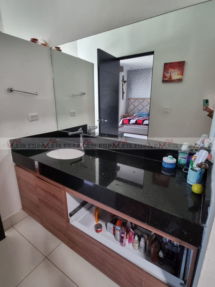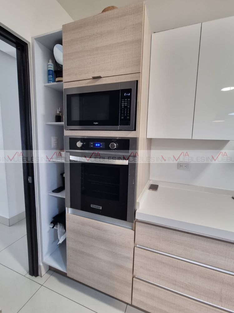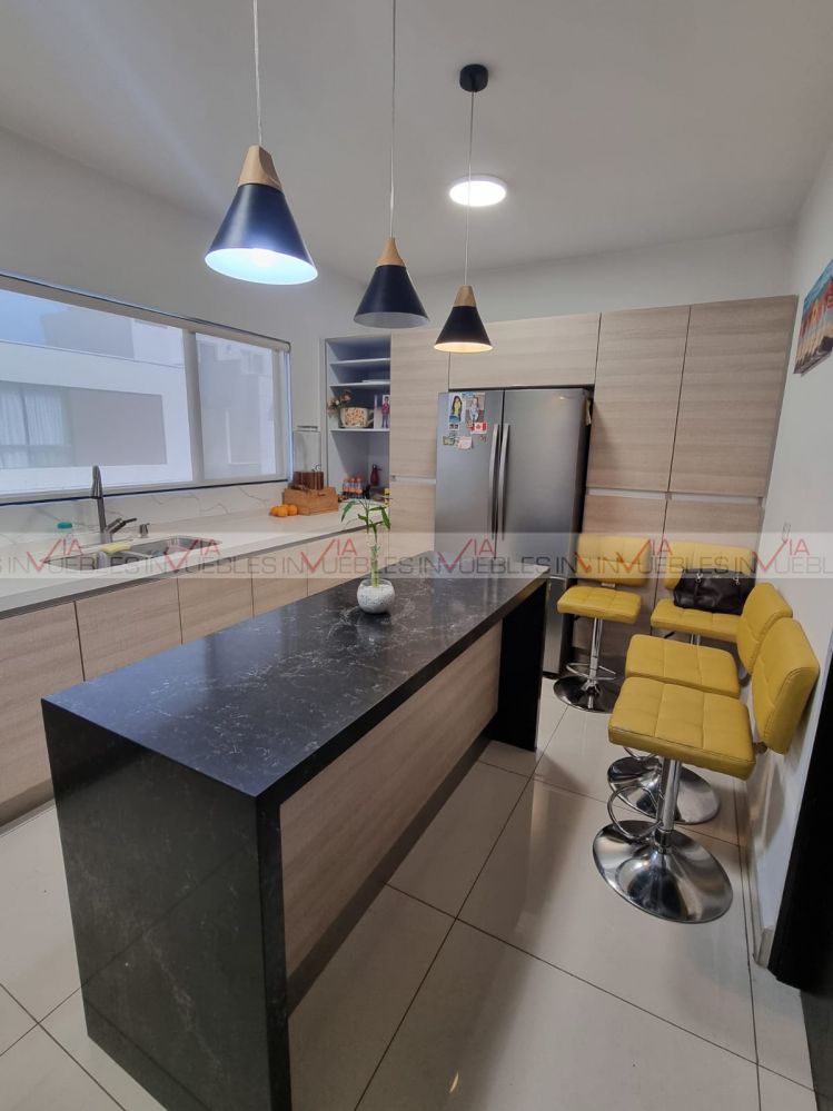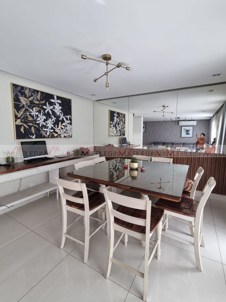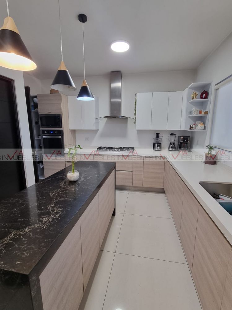 Segunda planta: amplia estancia, sala y comedor con grandes ventanales hacia el jardín que es muy amplio, cocina moderna totalmente equipada, con mueble de hornos empotrados y cuenta con isla, medio baño de visitas. Área de lavado con lavadora y secadora.