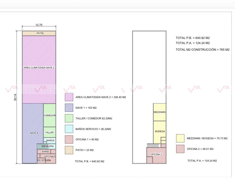 Planta baja: cuenta con área para recepción, oficinas administrativas, medio baño, el área de la Nave 1 es de 163m2, taller, comedor, 2 medios baños y un área climatizada en la Nave 2 de 326.4 m2 y un patio trasero de 23m2. Altura libre de 6 mts.