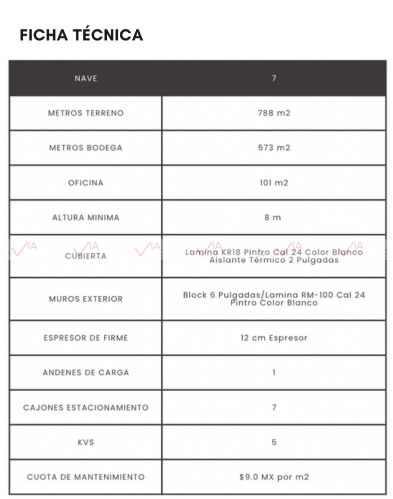 Con 573 m2 de bodega y 101m2 de área de oficina las cuales incluyen 7 medios baños. Total de construcción 674m2. En un lote de 788m2 de terreno. Cuenta con 7 cajones de estacionamiento, 1 Andene de carga. Servicios de luz y agua. Areas verdes. Limpieza del Parque.