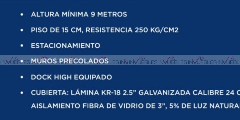 esta bodega cuenta con 987 metros de terreno, 825 de construcción, piso de 15cm de resistencia 250kg/cm2 dock high equipado, muros pre colados y estacionamiento