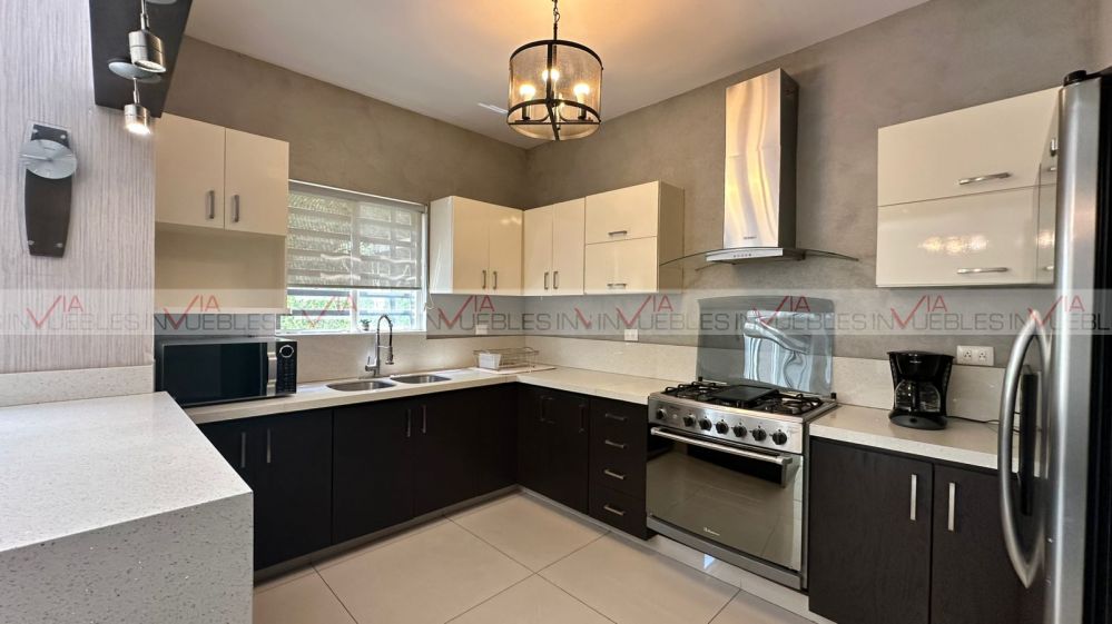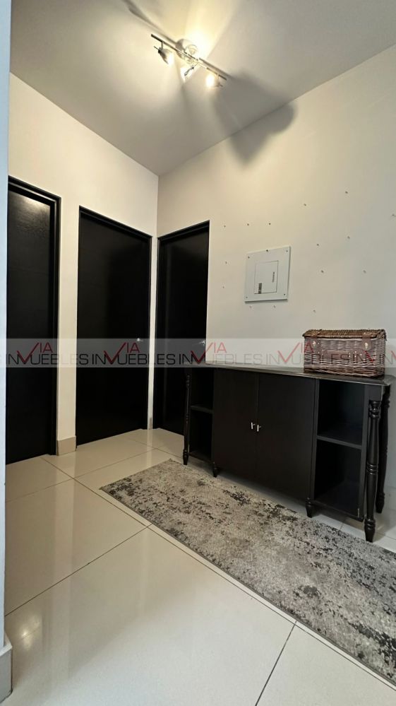 Cuenta con cochera para dos autos con portón eléctrico doble, recibidor, medio baño para visitas, amplia sala, cuarto de almacén, espacioso comedor y hermosa cocina equipada con barra de piedra de cuarzo.