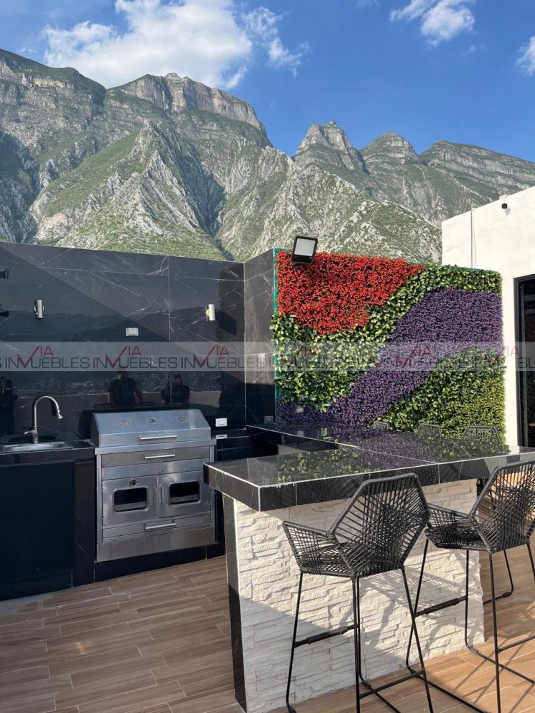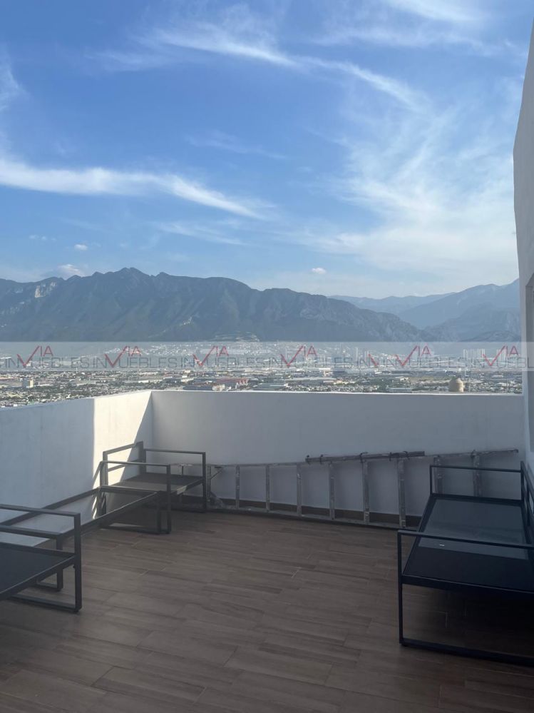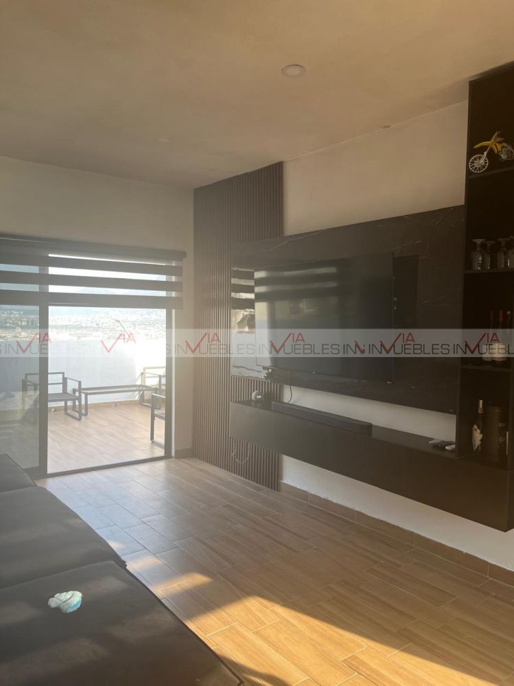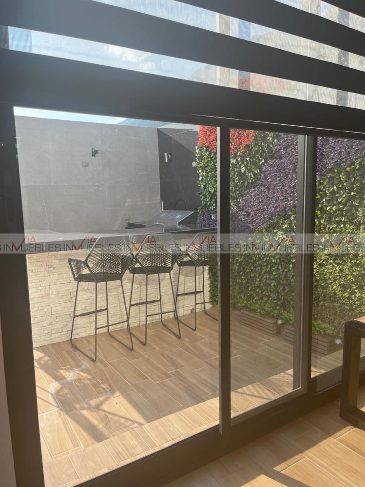 Hermosa casa de 3 plantas en fraccionamiento privado, con diseño y acabados de lujo. Primera planta: Sala, comedor, cocina integral con barra de cuarzo negro estelar, lavandería techada, 1/2 baño, cochera para 2 autos. Segunda Planta: Recamara principal con baño completo y closet muy amplio, 2 recamaras secundarias que comparten baño completo y balcón grande. Tercer planta: Sala de televisión, roof garden con area para asador y terraza al frente con hermosas vistas a la ciudad, a la huasteca y al cerro de las Mitras. Equipada con 5 minisplit, tinaco, cámaras de seguridad. El fraccionamiento cuenta con parques, canchas y casa club.